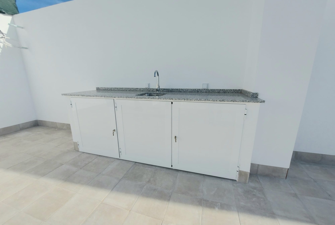 The kitchens will come fully equipped, designer, in white combined with a wood effect styling , They include a refrigerator, oven, integrated dishwasher, ceramic hob and extractor hood. The bathrooms will be delivered complete, with bathroom furniture, mirror, lighting and shower screen. In the solarium we will install a summer kitchen to enjoy those pleasant barbecues under the Spanish sun. In the bedroom closets we will include the drawers and they will be lined inside.